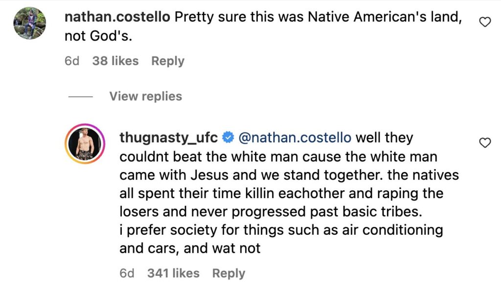 Most of it has a sort of ignorant charm that you can’t help, but laugh at. Unfortunately, Mitchell has also outed himself as an unadulterated bigot on more than one occasion — as evidenced by a recent post on Instagram where the 16-2 fighter claimed that Indigenous Americans were too busy “killing each other and raping the losers” to defend themselves when the white man came to steal their land.