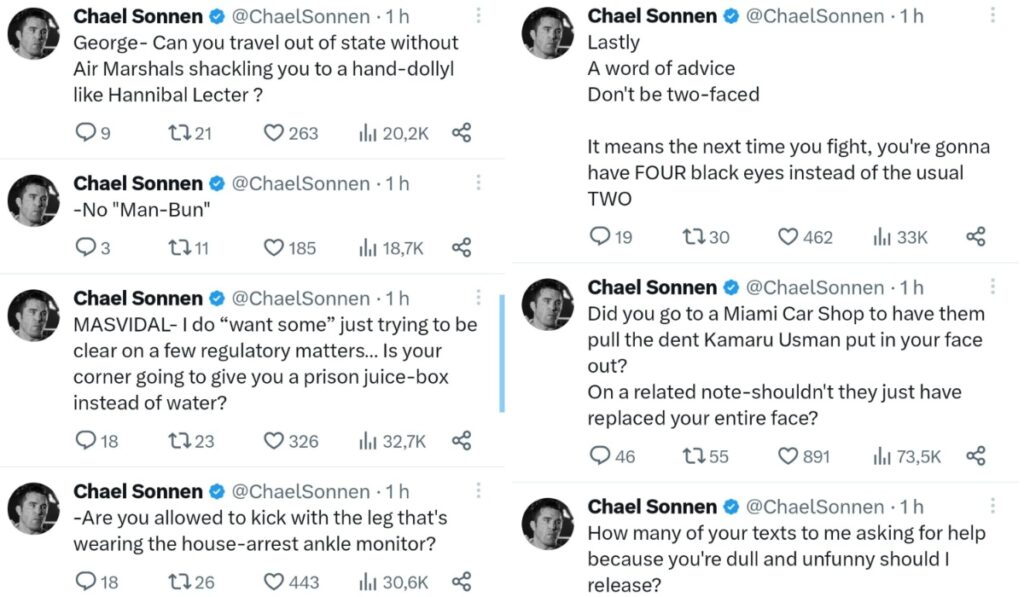 Reacting to Masvidal’s comments, Chael Sonnen went on an absolute tear, shredding the two-time title challenger in a series of scathing responses on social media.
