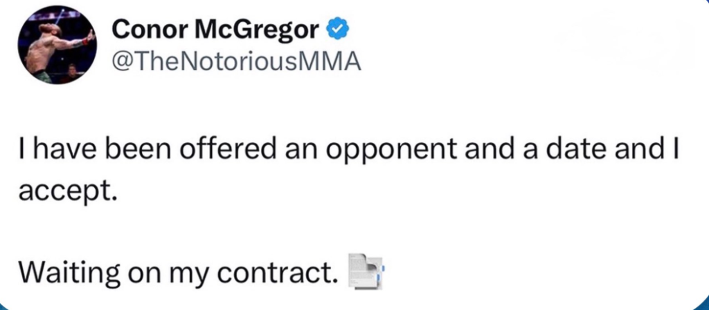 Recently, “The Notorious” posted on X, claiming that he’s been offered an opponent and a date for his comeback, which he has accepted. However, he is still waiting for his contract.