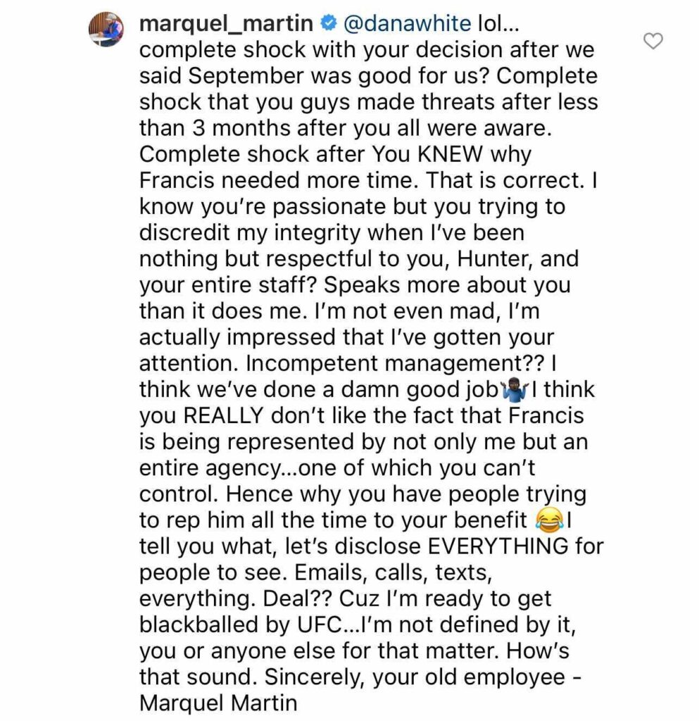 “Incompetent management? I think we’ve done a damn good job. I think you REALLY don’t like the fact that Francis is being represented by not only me but an entire agency…one of which you can’t control. Hence why you have people trying to rep him all the time to your benefit. I tell you what, let’s disclose EVERYTHING for people to see. Emails, calls, texts, everything. Deal?? Cuz I’m ready to get blackballed by the UFC…I’m not defined by it, you or anyone else for that matter. How’s that sound. Sincerely, your old employee – Marquel Martin.”