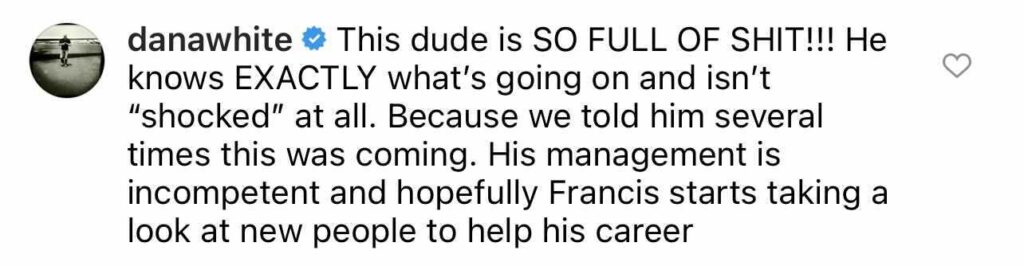 “This dude is SO FULL OF SH*T!!!” White replied. “He knows EXACTLY what’s going on and isn’t “shocked” at all. Because we told him several times this was coming. His Management is incompetent and hopefully Francis starts taking a look at new people to help his career.”