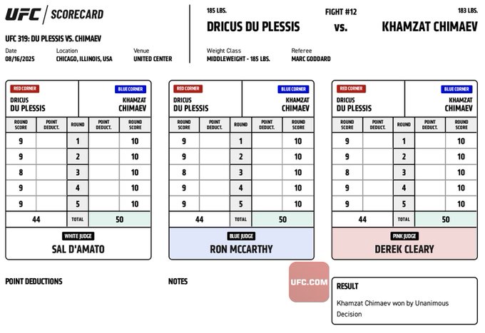 Despite logging a dozen takedowns and more than 21 minutes of control time throughout their five-round affair, Chimaev only banked one 10-8 round across the three scorecards handed in.
