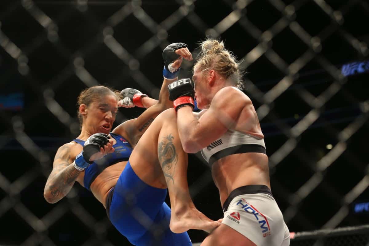 “The Preacher’s Daughter” moved forward with strikes to begin the third round. Holm had her head kick blocked. Holm moved in to get a hold of her opponent, but couldn’t do so. A kick to the body was there for “The Iron Lady.” Holm got a hold of de Randamie, but ate an elbow followed by a left hook.