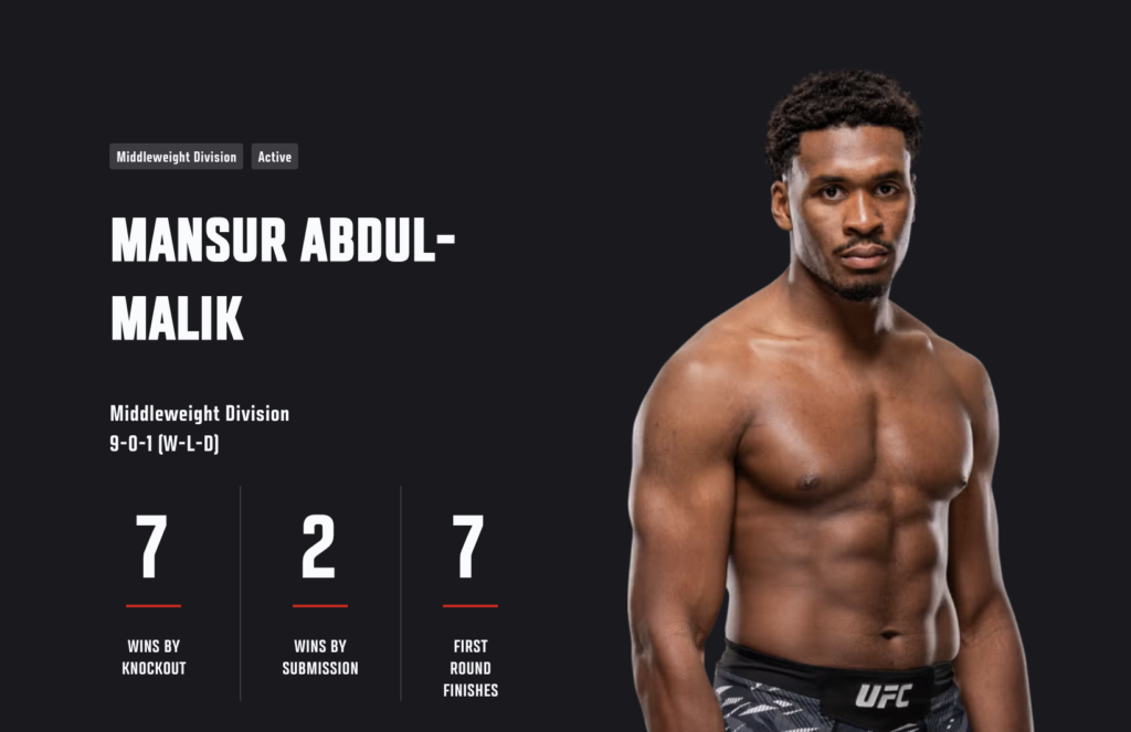 In 2024, Mansur Abdul-Malik earned a Round 2 TKO victory over Wes Schultz on Dana White’s Contender Series to secure a UFC contract.