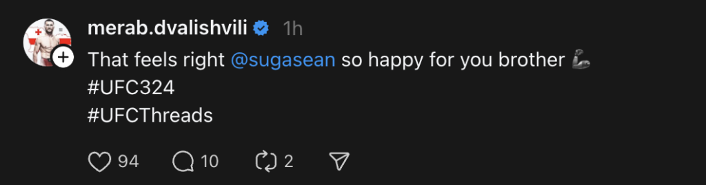 “That feels right @sugasean so happy for you brother 🦾 #UFC324 #UFCThreads”