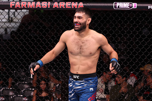 RIO DE JANEIRO, BRAZIL – OCTOBER 11: Michael Aswell Jr. reacts after a victory against Lucas Almeida of Brazil in a featherweight fight during the UFC Fight Night event at Farmasi Arena on October 11, 2025 in Rio de Janeiro, Brazil. (Photo by Ed Mulholland/Zuffa LLC)