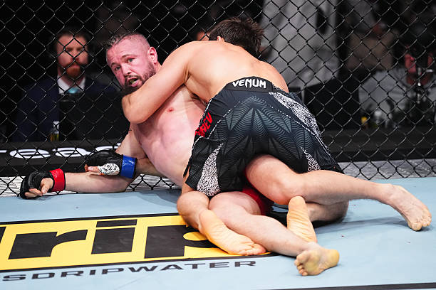 Dalby attempted another trip in the center of the Octagon, but just as he did before, Izagakhmaev reversed and took his opponent’s back in the process. Izagakhmaev slapped on a body triangle, but Dalby turned himself, getting into top control with little more than 30 seconds left in the stanza. Dalby was unable to capitalize on the position, sending us to the third round with the score potentially tied.