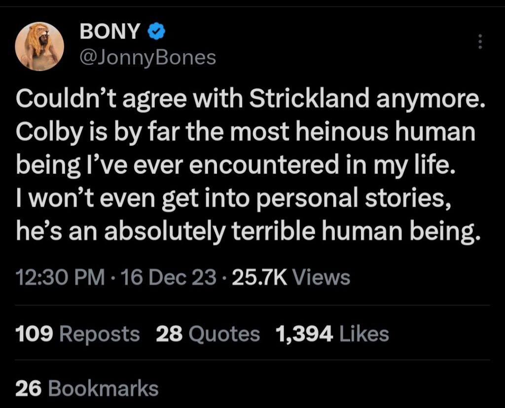 “Couldn’t agree with (Sean) Strickland anymore,” Jon Jones posted on his official X account. Colby (Covington) is by far the most heinous human being I’ve ever encountered in my life. I won’t even get into personal stories, he’s an absolutely terrible human being.”