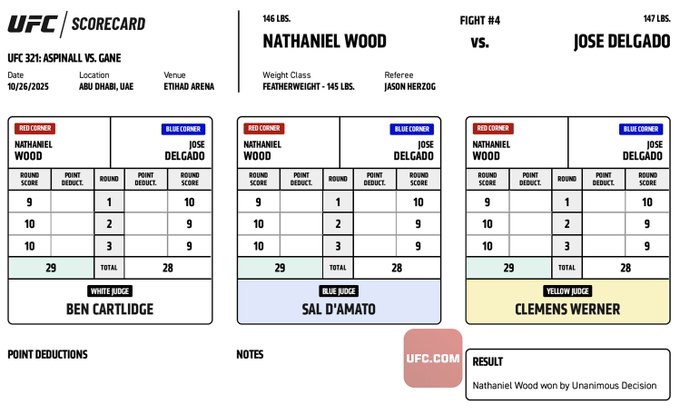 Official Result: Nathaniel Wood def. Jose Delgado via unanimous decision (29-28, 29-28, 29-28).