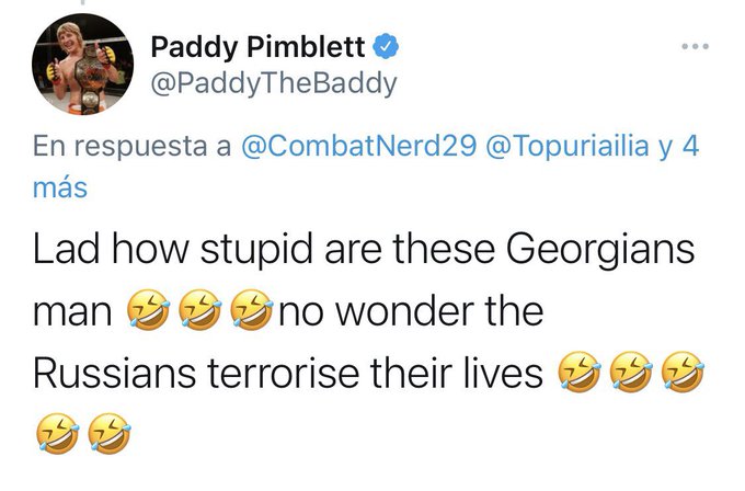 “Lad how stupid are these Georgians man [LAUGHS],” Pimblett tweeted. “No wonder the Russians terrorise their lives [LAUGHS].”
