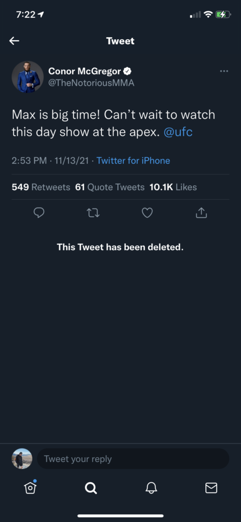 McGregor was vocal for the entirety of UFC Vegas 42. He was very excited to see Holloway fight tonight as he posted on Twitter about it a few times. Those tweets have also been deleted, but thanks to screenshots we still have them.
